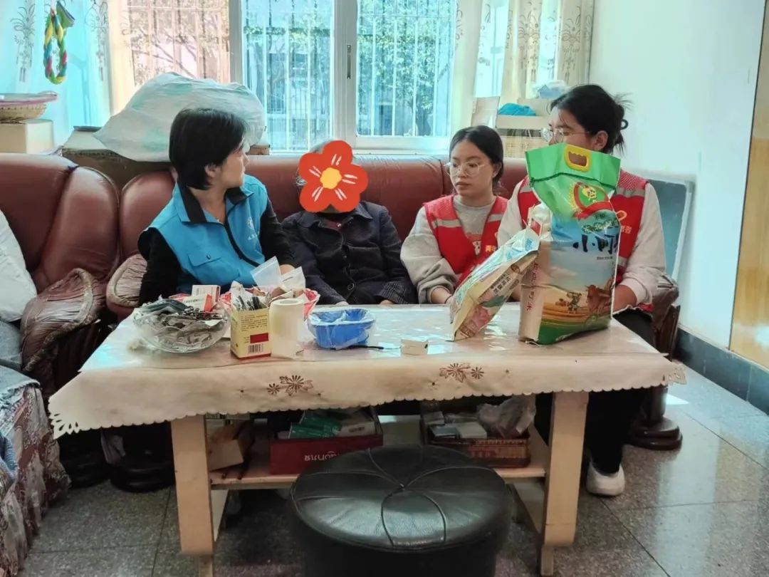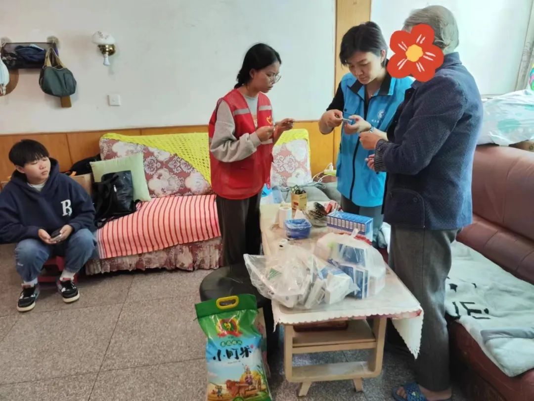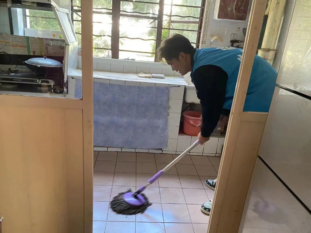 随后,志愿者又来到了81岁老人李奶奶家中。老人现处于独居、丧偶状态,她的儿子也在早年就离开了人世。在老人家中,志愿者们为其打扫了卫生、送上生活物资、清洗碗碟、与老人交谈、询问老人的生活情况和健康状况。志愿服务期间,老人激动地表示:“谢谢你们,在这个特殊的节日里面给我送来这么多的关爱和礼物。”