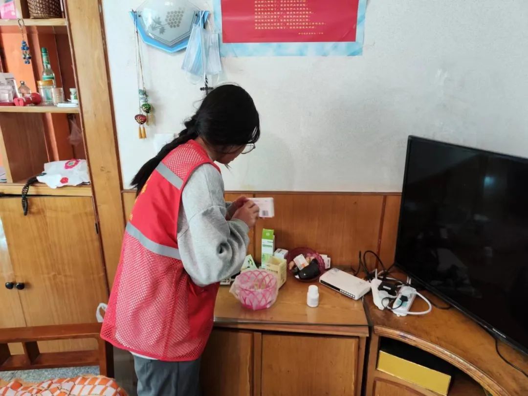 最后,志愿者们又去到了73岁老人李奶奶家中,老人同样也是处于独居状态且身患残疾,农职志愿者来到老人中,帮助其打扫卫生、查看药品、陪老人说话等。