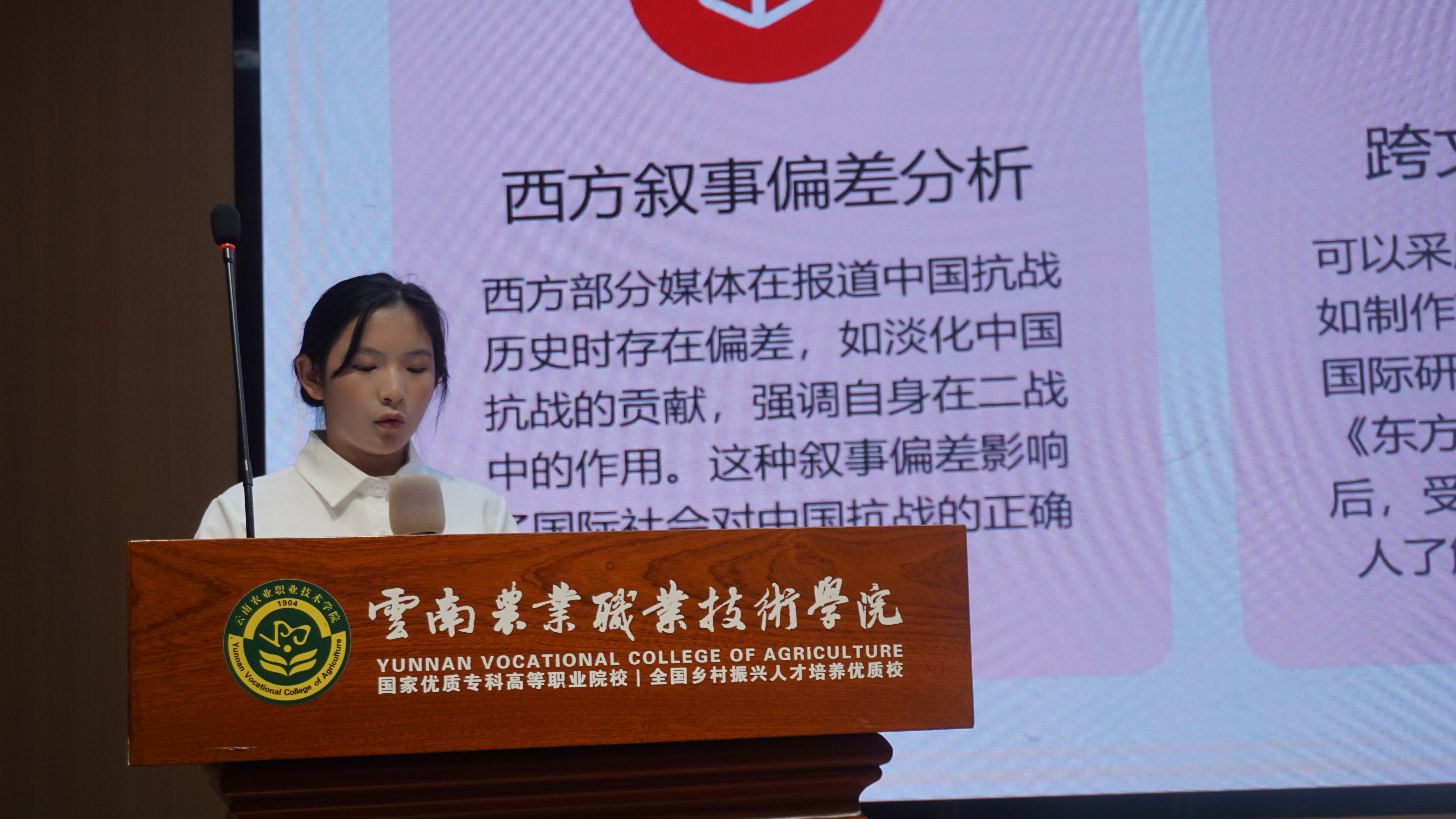本次活动以“传承伟大抗战精神,让理想信念照亮前行路”为主题,由24级环境艺术设计三班禄恩靖、24级环境艺术设计二班李彦宜、24级园林工程技术一班方诗闲、24级环境艺术设计二班赵玉慈、24级烹饪工艺与营养一班侯尚巧、24环境艺术设计一班赵子媛、24级园林工程技术一班董雪、24级园林工程技术一班普紫薇共8位同学担任主讲人,带领同学们回溯抗战烽火岁月,解读伟大抗战精神谱系,探寻其当代价值与传承路径。