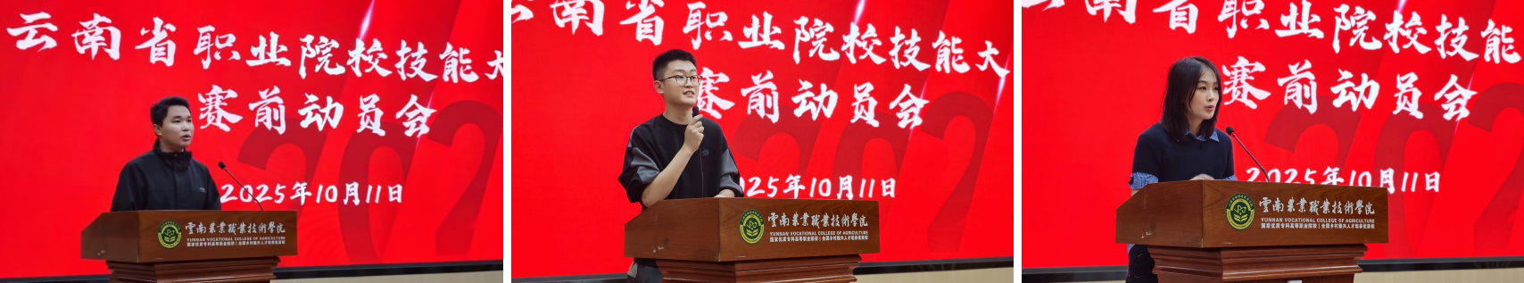 参赛选手代表23级酒店管理与数字化运营一班马莺、23级电子商务二班熊成林依次上台发言,表达了珍惜机会、全力以赴的决心,书写年轻选手的蓬勃斗志;人工智能+赛项指导教师李艳花作为教师代表,从训练组织、技术突破、心理调适等角度分享了指导经验,鼓励同学们沉着应战、发挥实力。