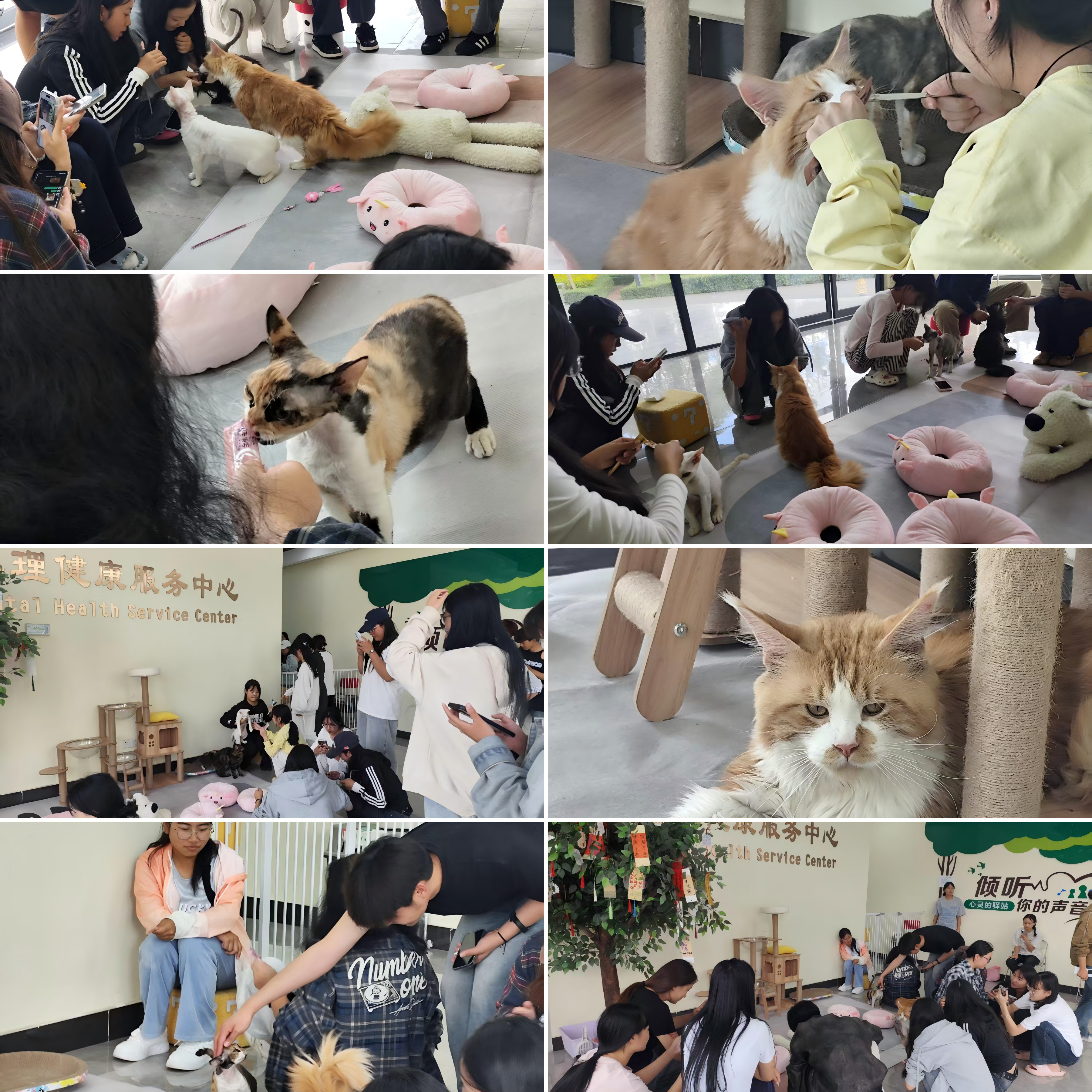 “萌宠伴心”互动区成为当日最受欢迎的“心灵减压站”。温顺的猫咪或蜷缩休憩,或与师生亲密互动,现场配备的宠物零食与玩具进一步增强了体验趣味性。参与师生通过轻抚、嬉戏等互动方式逐渐放松身心,腼腆的同学也在温馨氛围中敞开心扉,现场欢声笑语不断。