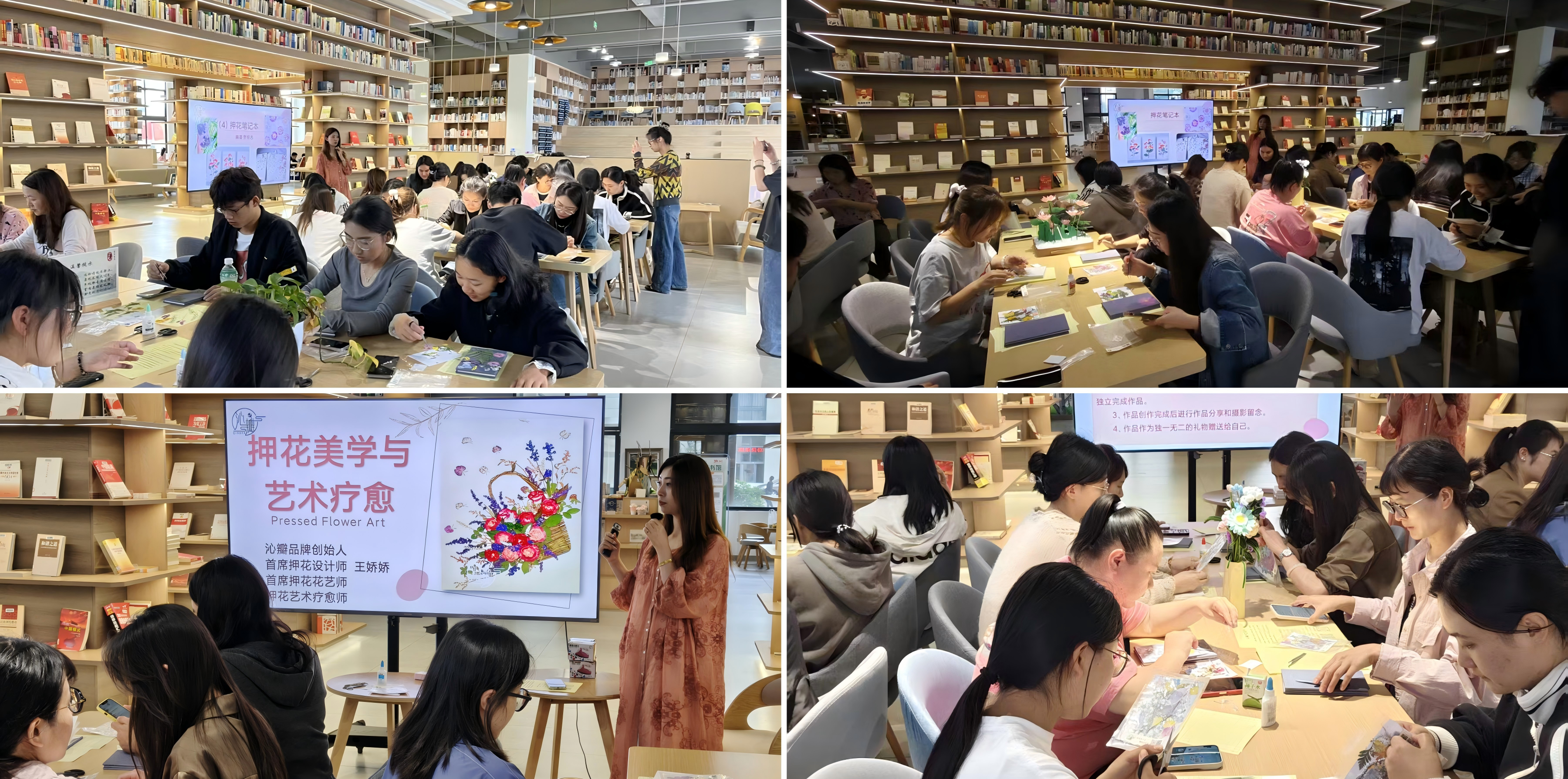 押花疗愈体验区设在图书馆一楼,50位师生在专业指导下参与创作。活动现场陈列了丰富的干花素材与押花工具,师生们通过挑选花材、构思构图、调整枝叶,在专注创作中缓解教学与学业压力。完成的押花作品兼具艺术性与个性化,成为师生情绪释放与成就感获得的载体。