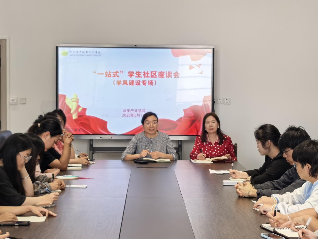 学生发展2025年5月7日14:00,云安产业学院在综合指挥中心会议室举办“一站式”学生社区学风建设专场座谈会。本次座谈会聚焦学风建设,重点围绕班级学风建设、晨练的组织与管理等问题展开讨论,为学院学风建设搭建了良好的交流平台。学院党总支副书记李萍、副院长王雪莲、学生工作办公室相关负责教师及各社团指导教师、学生代表、社团干部代表等参加会议。
