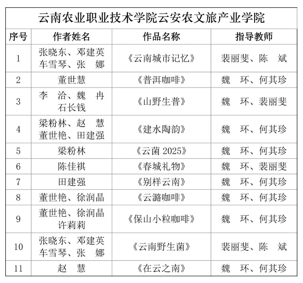 在此次展览中,云南农业职业技术学院云安农文旅产业学院共有11件作品成功入展。作品立足云南地域文化与生活资源,涵盖咖啡文化、自然生态、地方记忆、工艺创新等多个主题,充分展示了我院师生在“传统文化+现代设计”融合实践中的探索与成果。