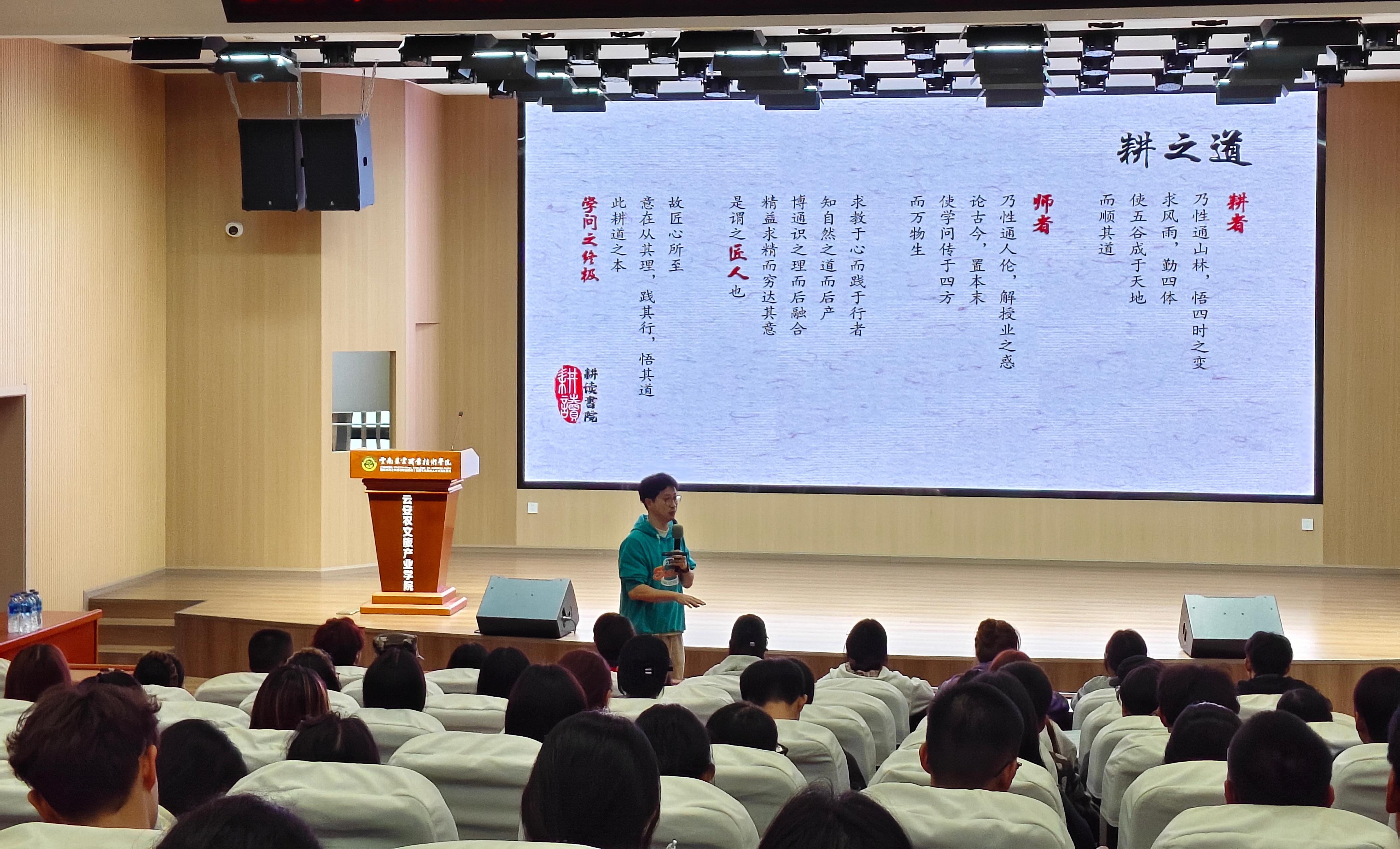 讲座伊始,唐律老师以“耕者”“师者”“匠人”三种身份为核心,系统阐释了“耕道”的深层意义。他指出,“耕者”需通晓自然规律、顺应四时变化,象征着对知识的敬畏与实践的坚守;“师者”应明辨人伦事理、启迪他人心智,体现了求知过程中对真理的探索与传承;“匠人”则追求精益求精、知行合一,代表着对专业技能的极致打磨与创新突破。三者相辅相成,共同构成了青年学子在求学与成长道路上的立体角色画像。