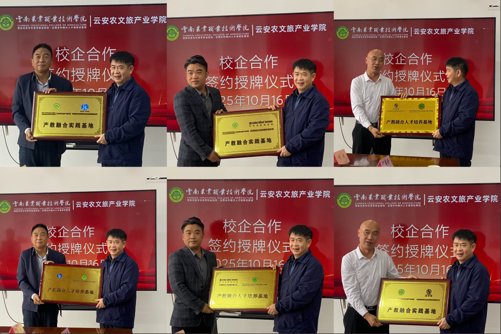 为深入贯彻《国家职业教育改革实施方案》要求,推动职业教育与产业发展深度融合,10月16日下午,云南农业职业技术学院云安农文旅产业学院与云南润色文化传播有限公司、云南拙智得企业管理策划有限公司、云南高夫生态园林实业发展有限公司在学院会议室举行校企合作签约暨授牌仪式。学院党总支副书记张业清、相关专业教研室主任、骨干教师代表与三家企业负责人共同出席仪式。