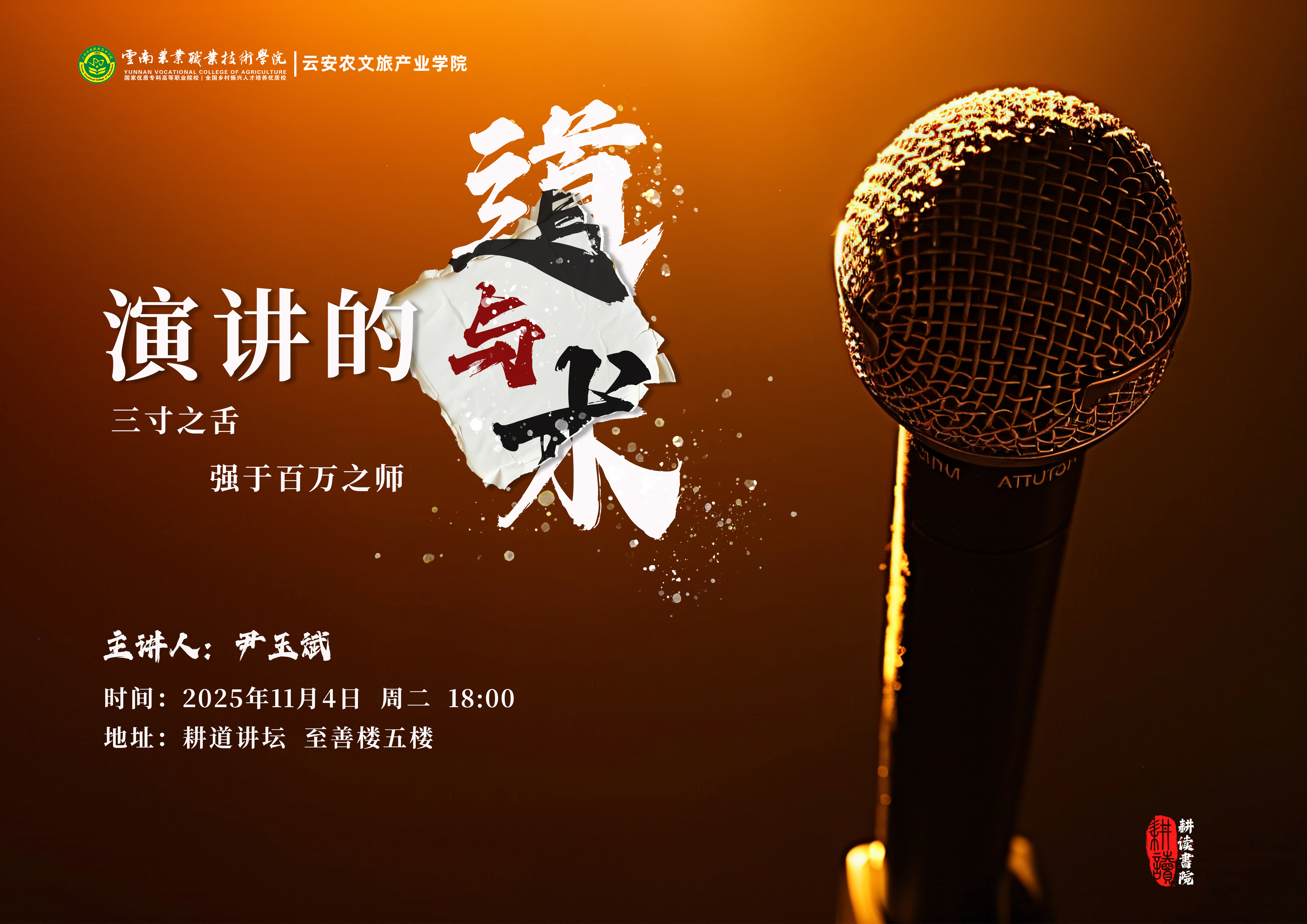 2025年11月4日晚,云南农业职业技术学院云安农文旅产业学院耕道讲坛举行以“演讲的道与术”为主题的讲座。本次讲座由尹玉斌老师担任主讲。