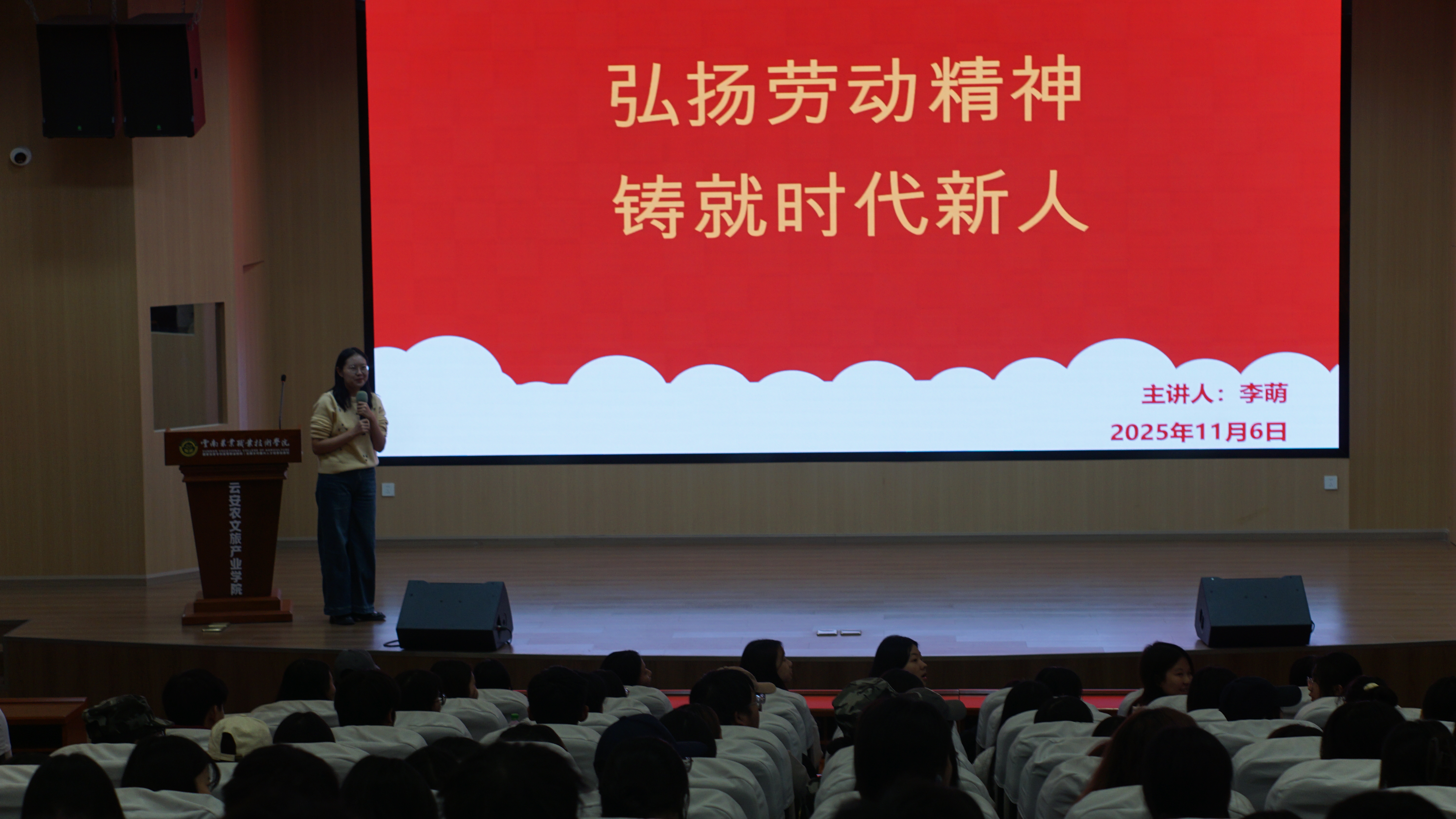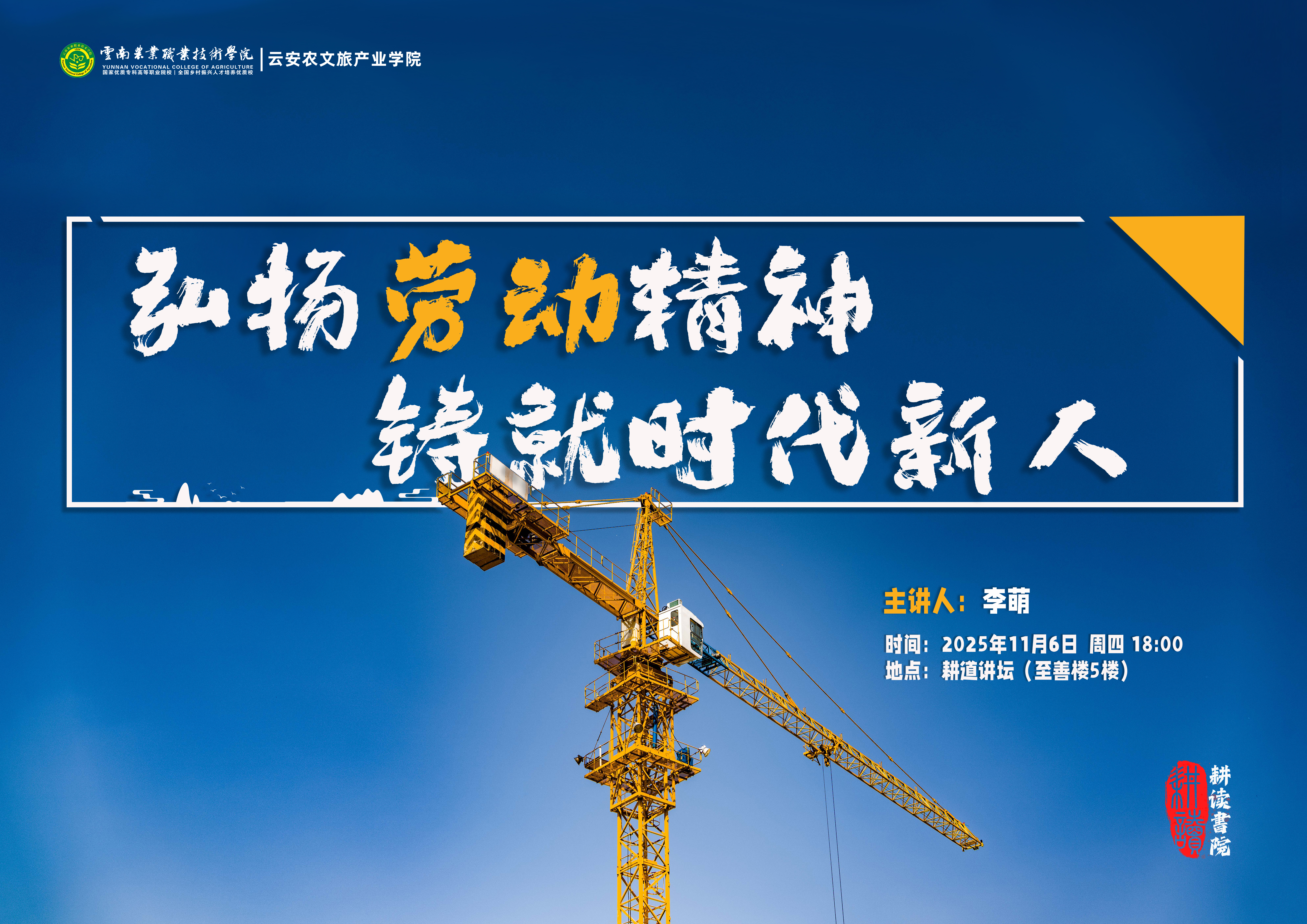 2025年11月6日18:00,云南农业职业技术学院云安农文旅产业学院耕道讲坛举办题为“弘扬劳动精神,铸就时代新人”的专题讲座。本次讲座由李萌老师担任主讲,并邀请张永淇、耿凤两位优秀校友担任分享嘉宾。