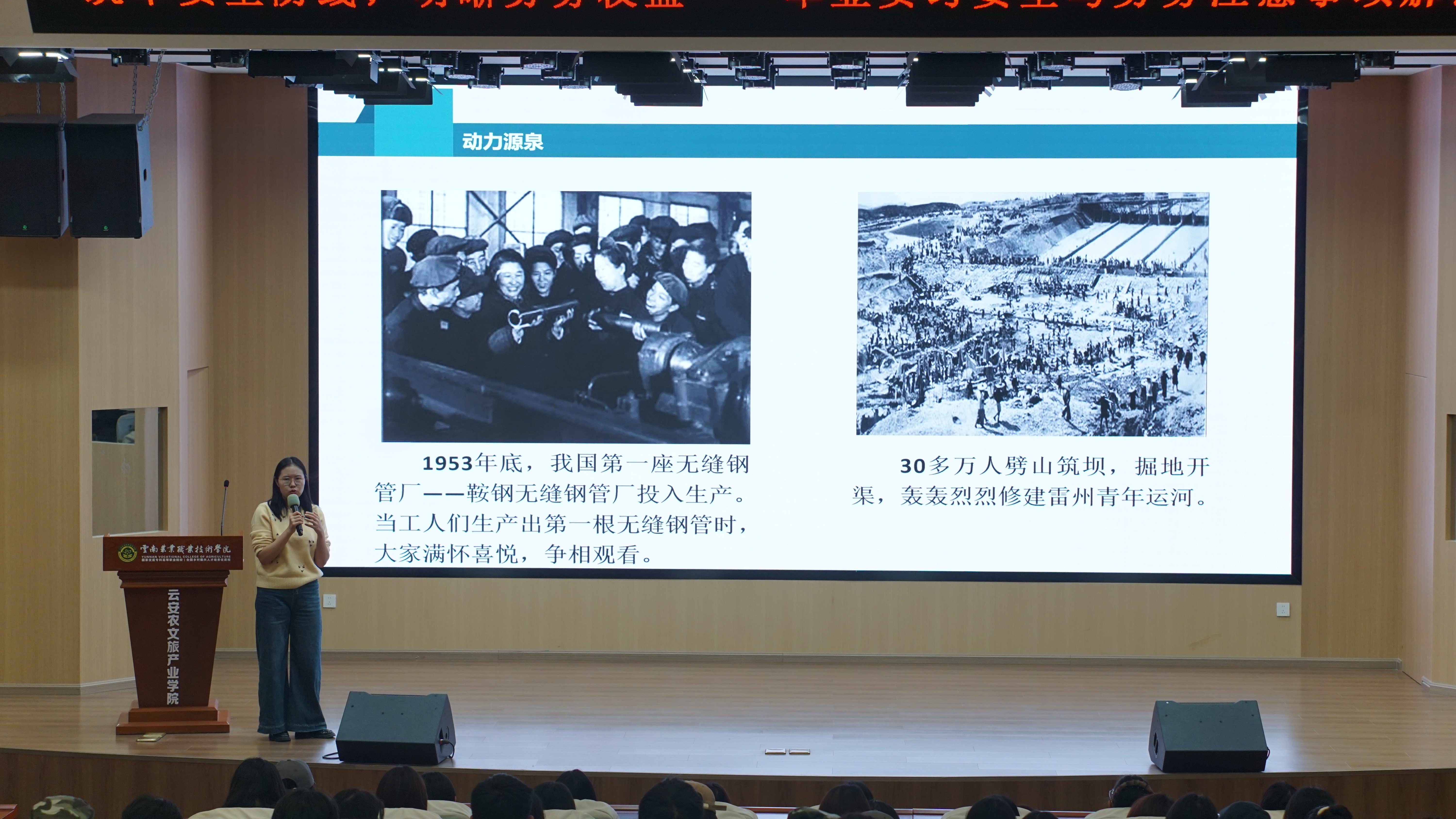 随后,李萌老师通过讲述我国第一根无缝钢管的诞生、雷州青年运河的开凿等事例,回溯了奋斗岁月中劳动者的坚守与付出,为青年践行劳动精神提供了鲜活参照。在此基础上,她进一步明确了“时代新人”应具备的思想道德素养与专业能力,并就在校学生如何践行劳动精神提出了切实可行的建议,如积极参与志愿服务、勤工助学等实践活动。