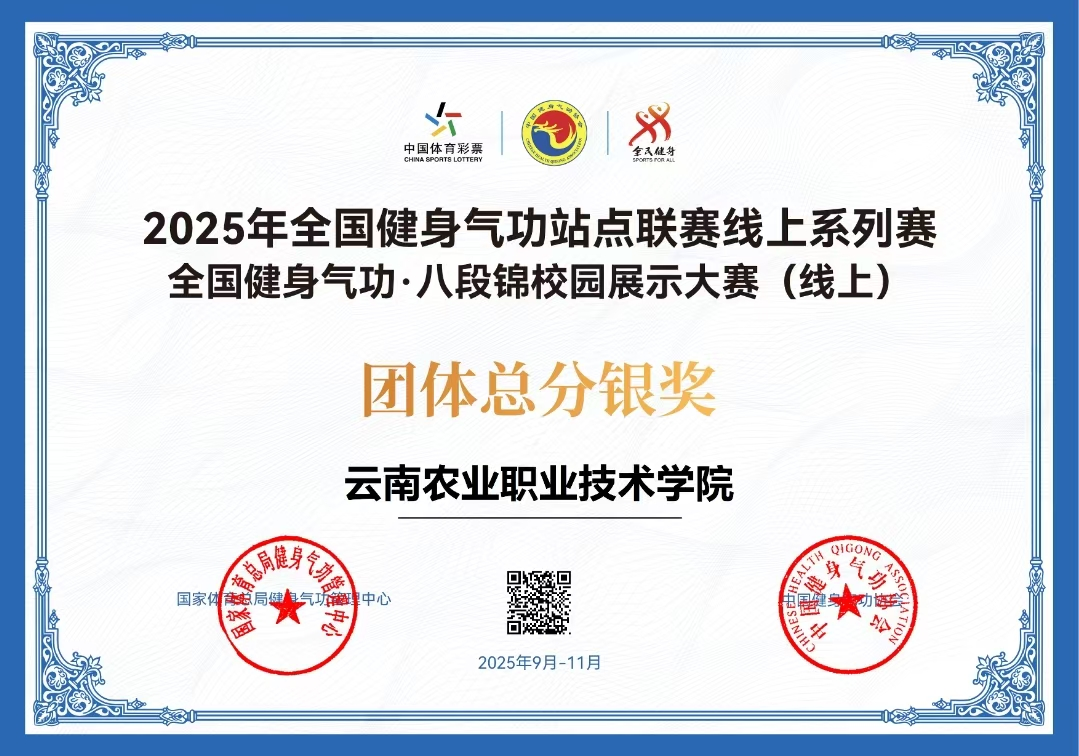 在2025年11月10日全国健身气功·八段锦校园展示大赛中,云南农业职业技术学院代表队团结协作、奋勇争先,最终荣获高校组“团体银奖”。
