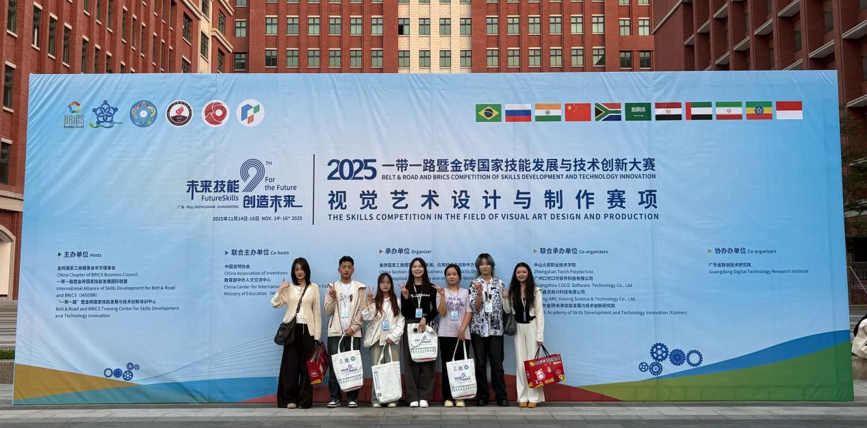 近日,2025“一带一路”暨金砖国家技能发展与技术创新大赛——视觉艺术设计与制作赛项(高职组)全国决赛在广东省中山市隆重举行。经过激烈角逐,云安农文旅产业学院23级包装策划与设计专业田建强、赵慧、董世艳、梁粉林、邹颜宇五位同学,在何其珍、魏环、裴丽斐三位教师的指导下,出色完成各项竞赛内容,荣获决赛二等奖1项、三等奖1项,指导教师获评“优秀指导教师奖”,学院荣获本赛事“优秀组织奖”。