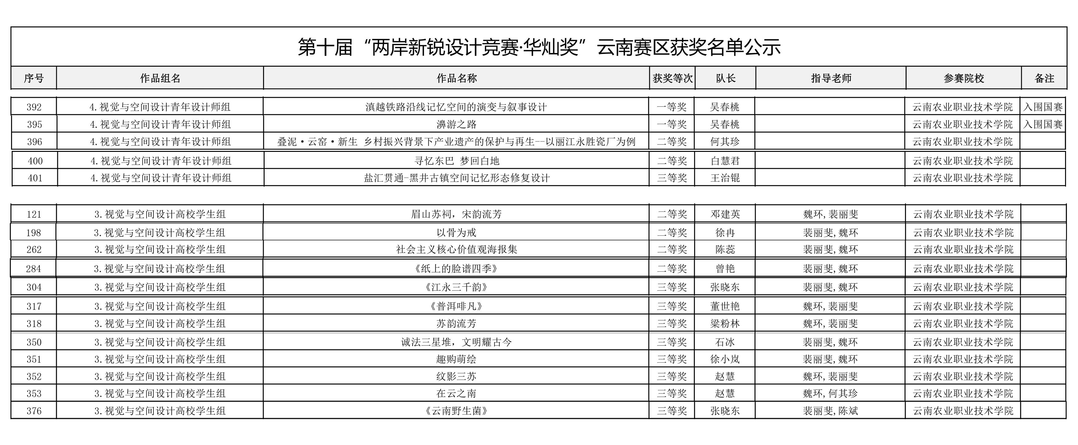 两岸新锐设计竞赛·华灿奖是入选教育部中国高等教育学会发布的《全国普通高校大学生竞赛排行榜》赛项,本次华灿奖的优异成绩,是学院近年来积极推进的项目化教学、乡村振兴实际项目训练、双导师制、“以赛促教、以赛促学”教学机制等改革成果的集中呈现。从课堂到竞赛,学院已形成“作品即项目、项目即学习”的育人模式,提升了学生创新表达能力和教师实践教学能力。