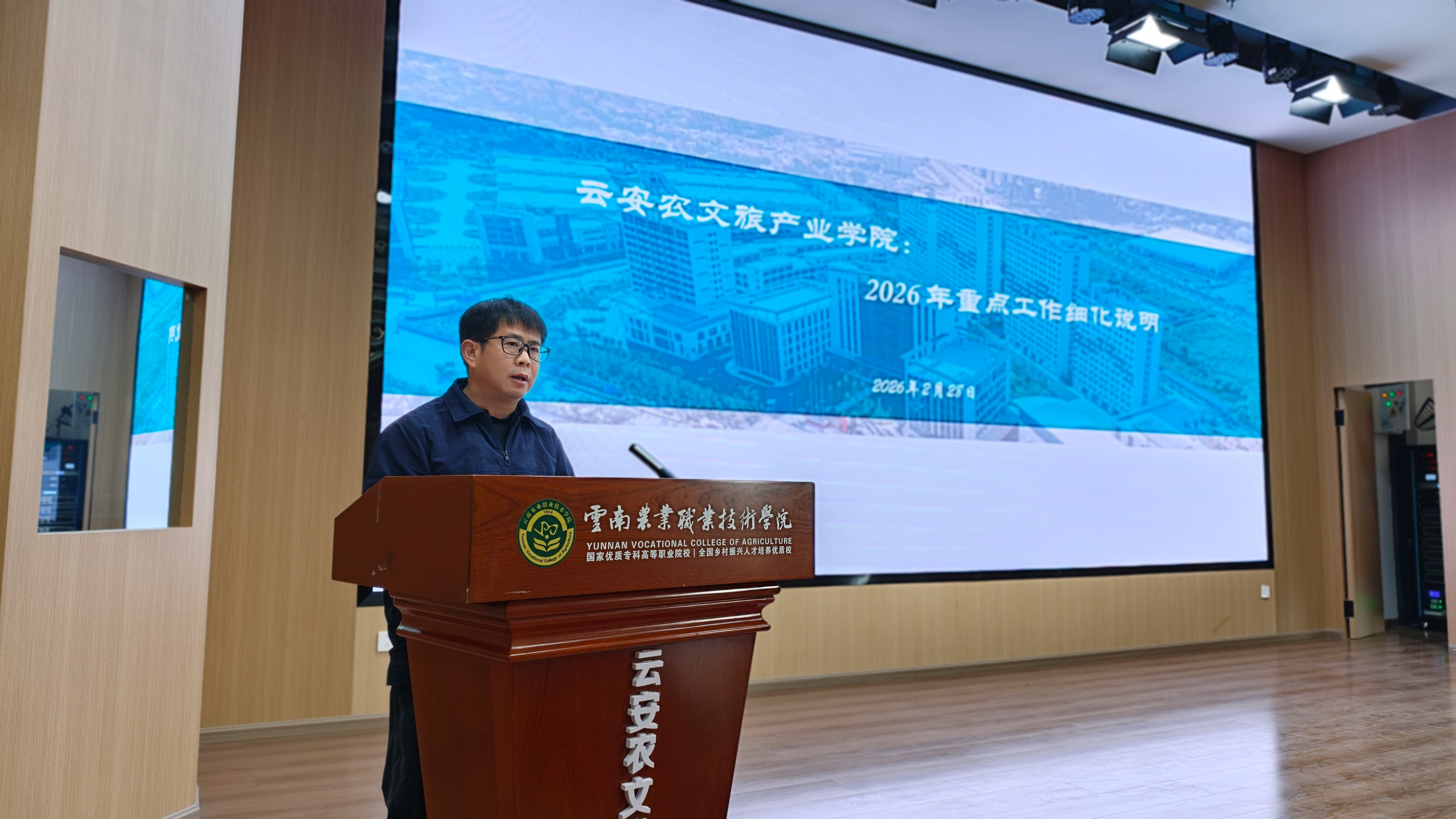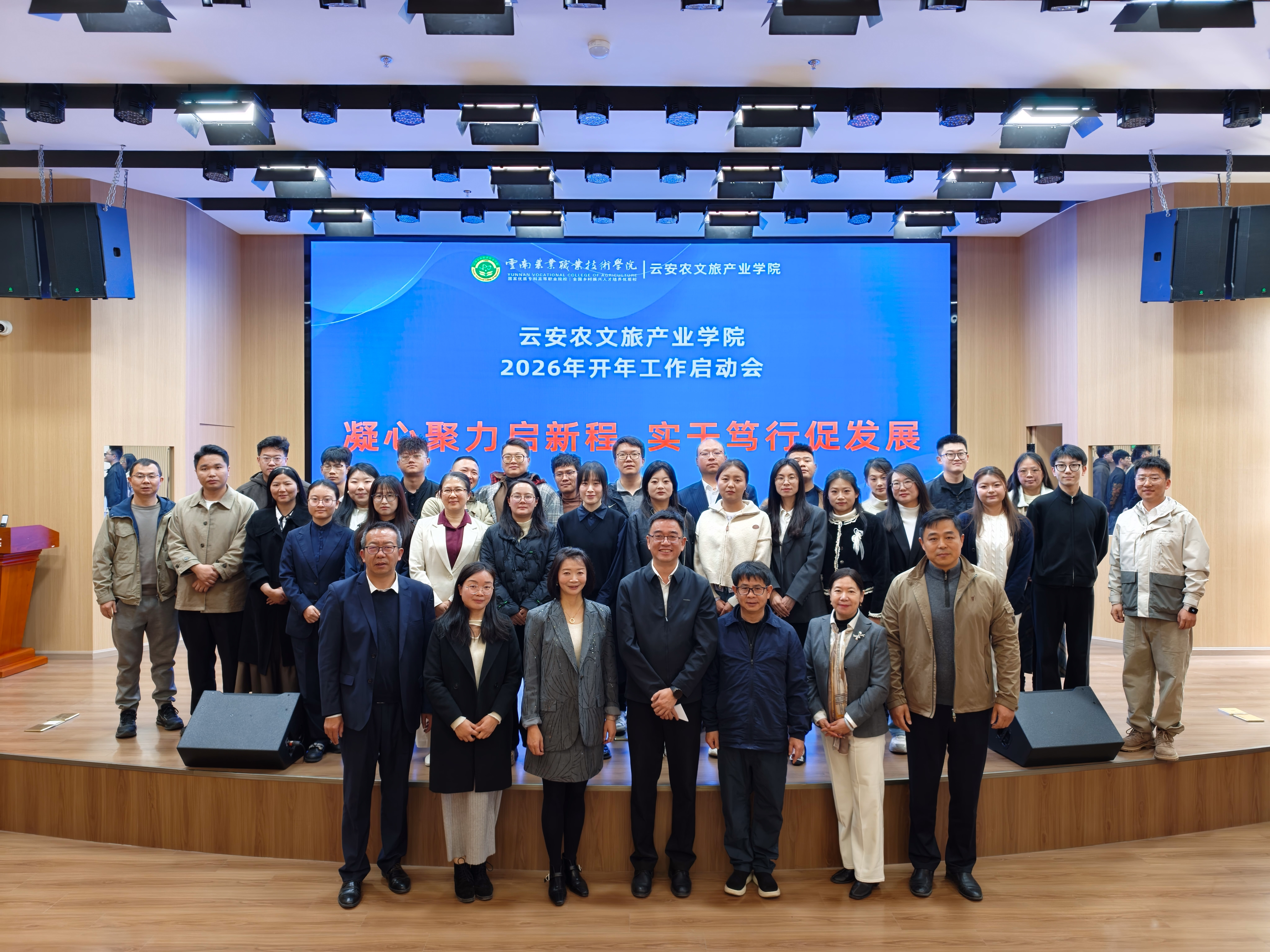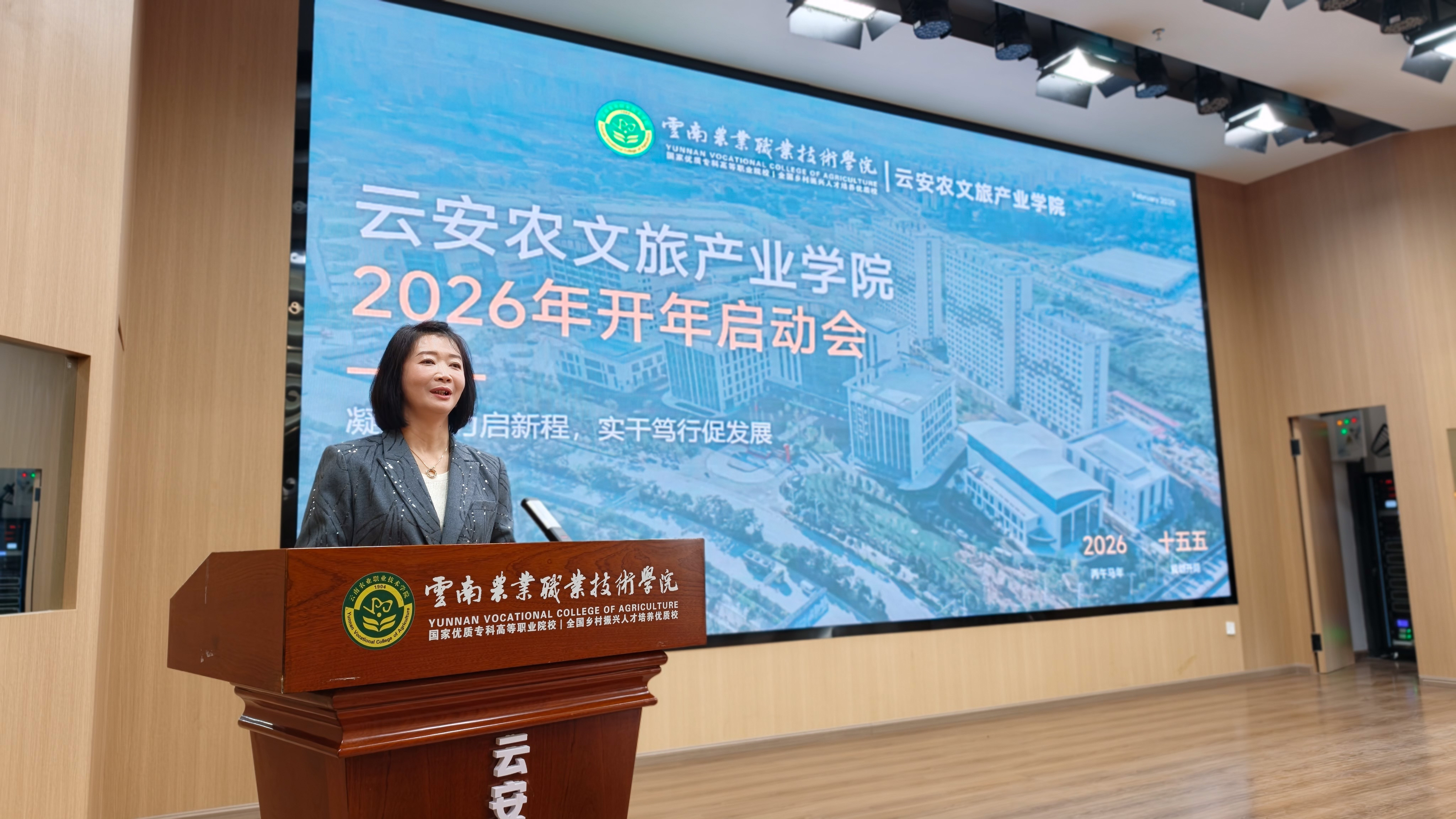 2026年2月28日上午,云南农业职业技术学院云安农文旅产业学院在至善楼耕道讲坛召开以“凝心聚力启新程,实干笃行促发展”为主题的2026年开年工作启动会。云安投资集团总裁、云南省餐饮与美食行业协会会长李艾奚女士,云安建筑股份有限公司、云安房地产开发有限公司总经理李永诚先生受邀出席会议,学院党政班子成员与全体教职工参会,会议由学院副院长李宏伟主持。