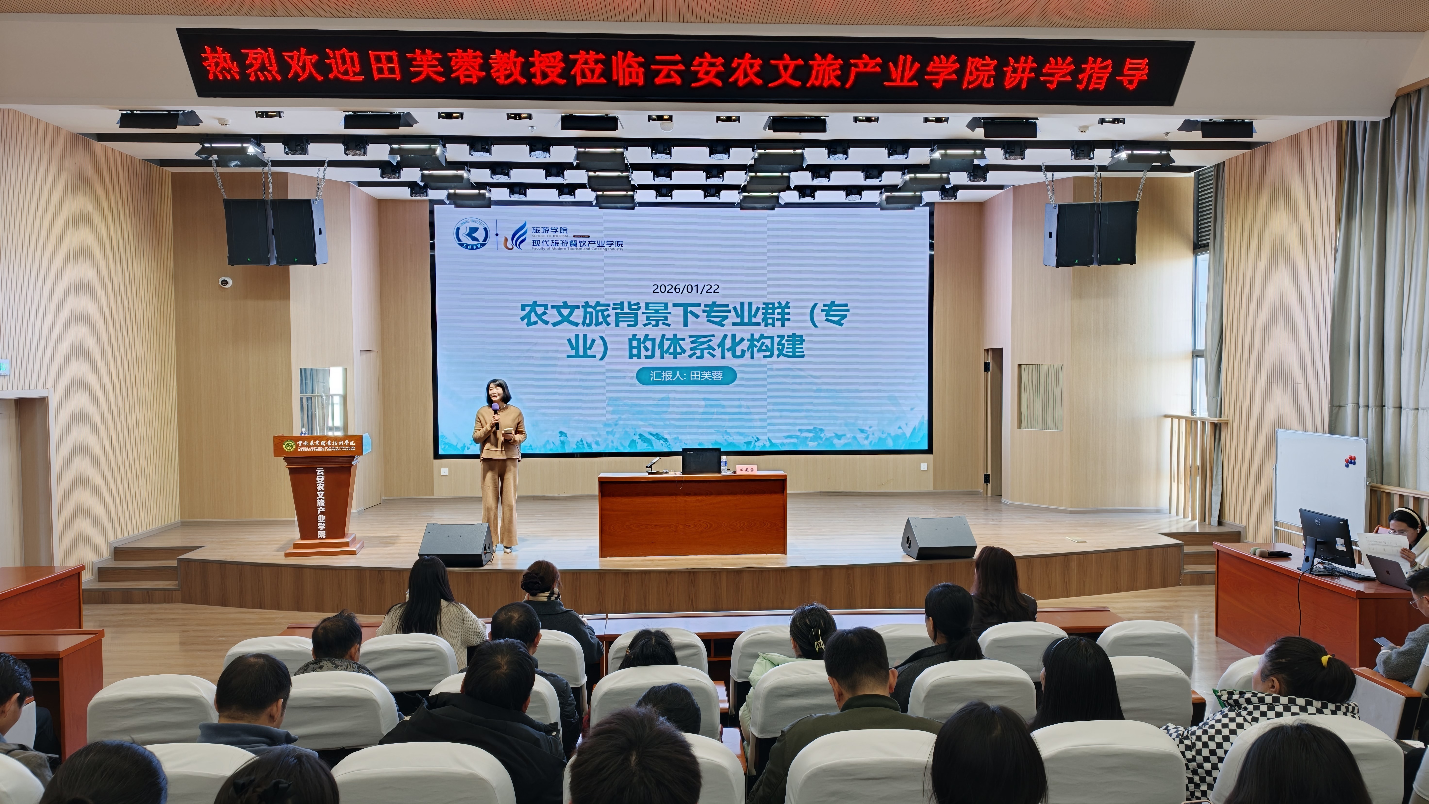 为深化农文旅融合发展认知,提升产业学院教学科研与实践运营能力,助力乡村振兴战略落地见效,2025年1月22日,云南农业职业技术学院云安农文旅产业学院特邀昆明学院旅游学院院长田芙蓉莅临学院,开展以“农文旅背景下专业群(专业)的体系化构建”为主题的专题培训。学院党政班子成员、全体教职工参加培训,培训由云安农文旅产业学院院长张杜娟主持。