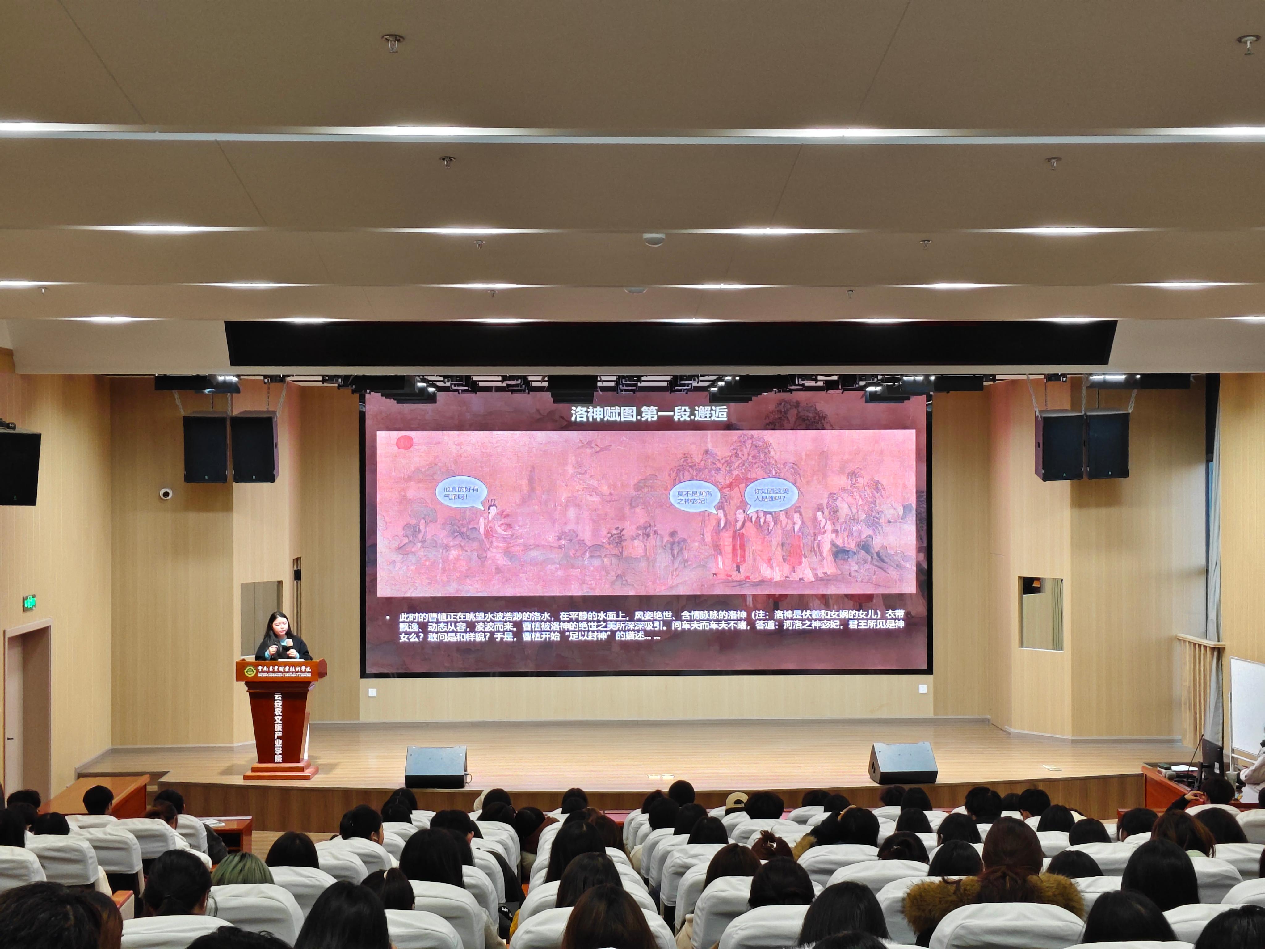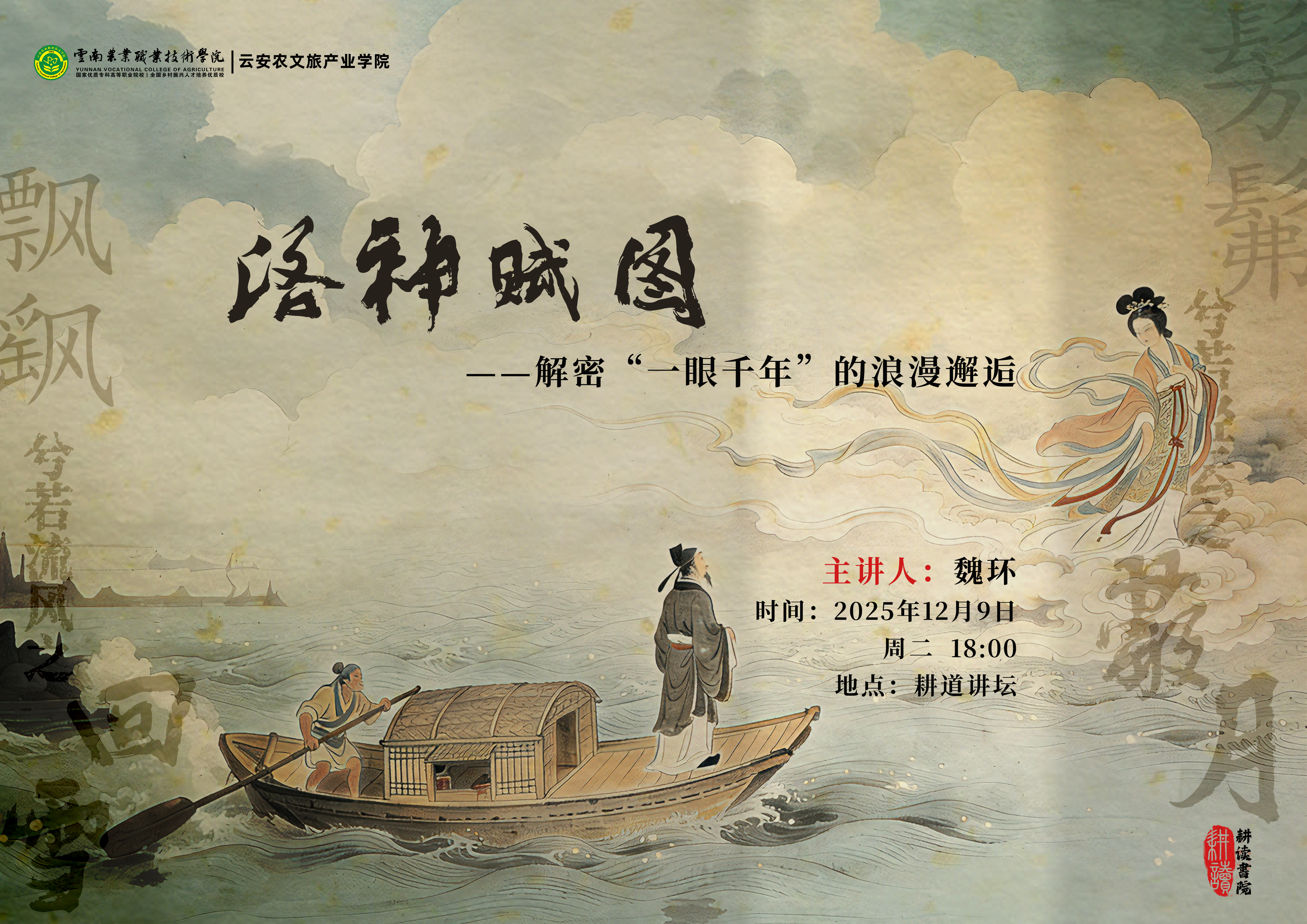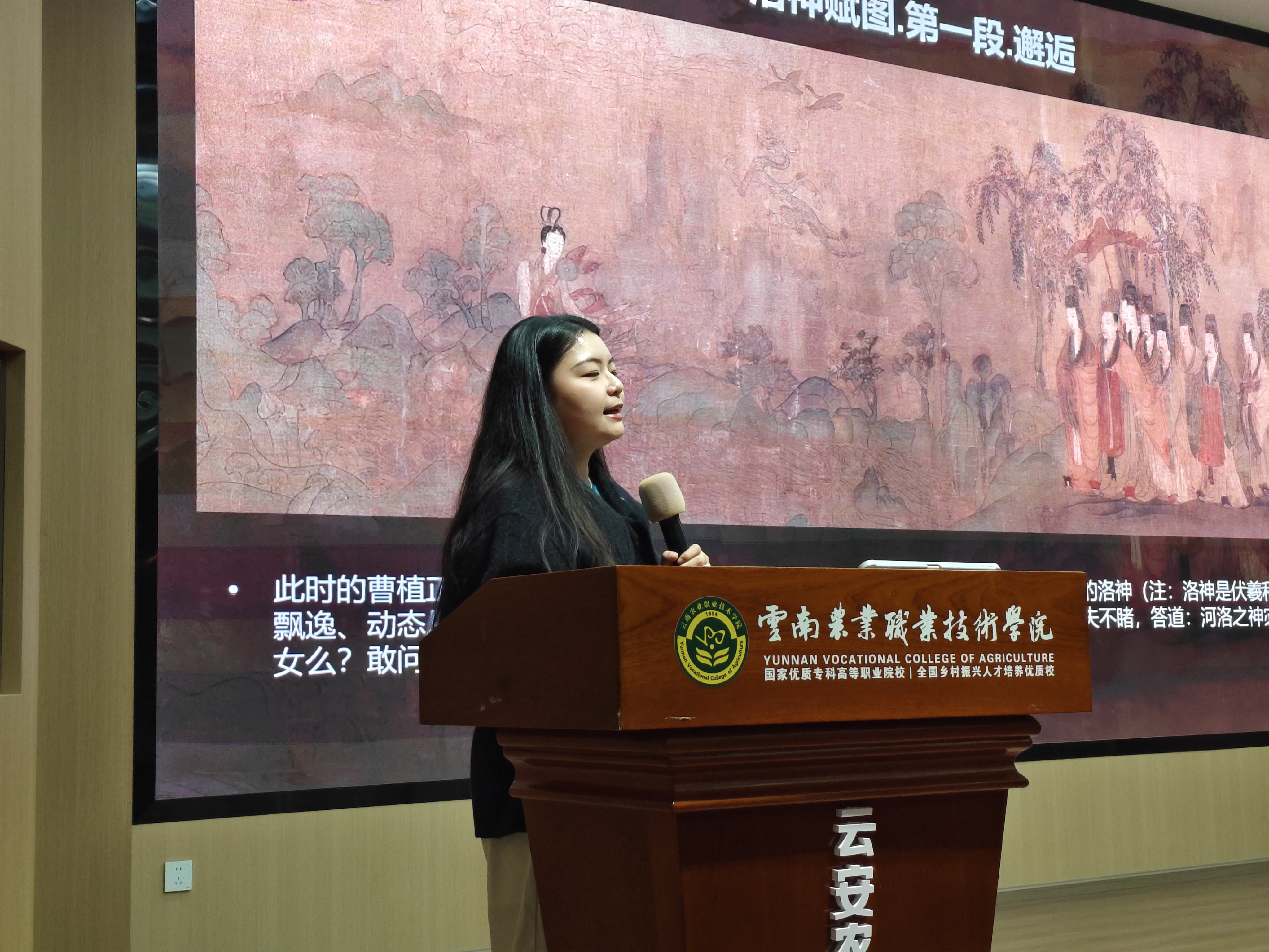 2025年12月9日晚,云南农业职业技术学院云安农文旅产业学院“耕道讲坛”第十七期讲座在至善楼504教室举办。本期讲座特邀学院设计教学团队教师魏环,作题为《洛神赋图》的专题分享。