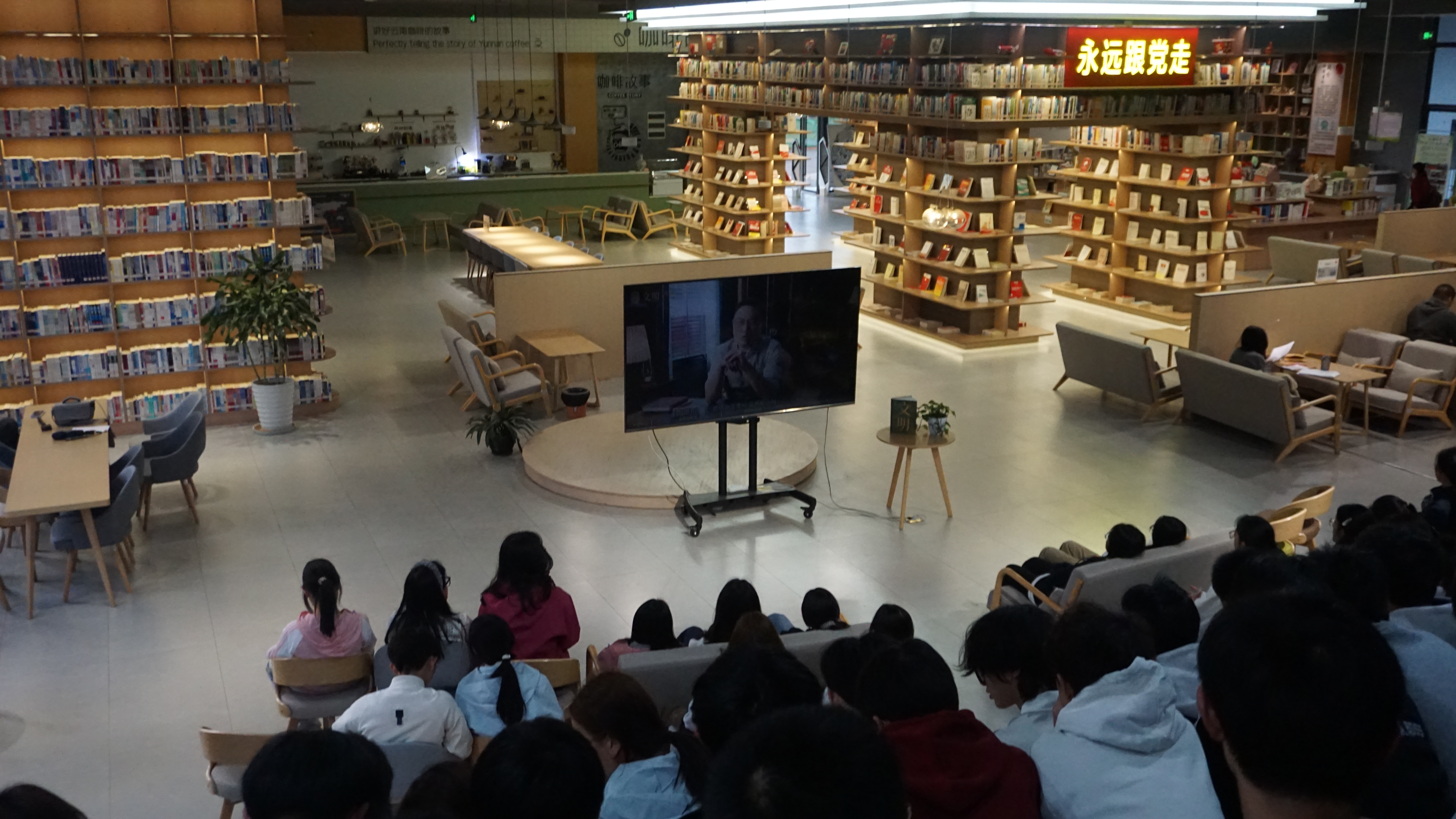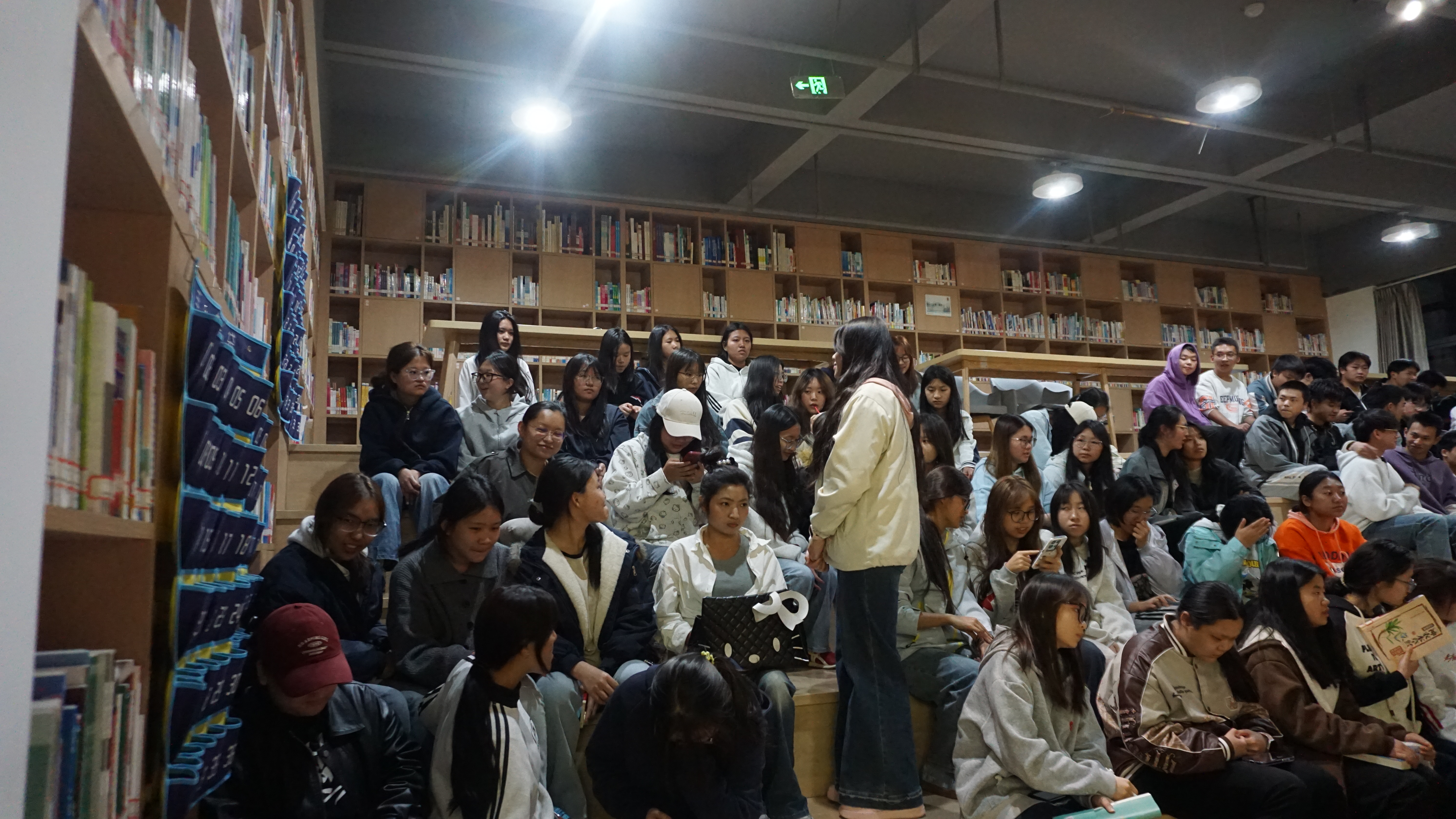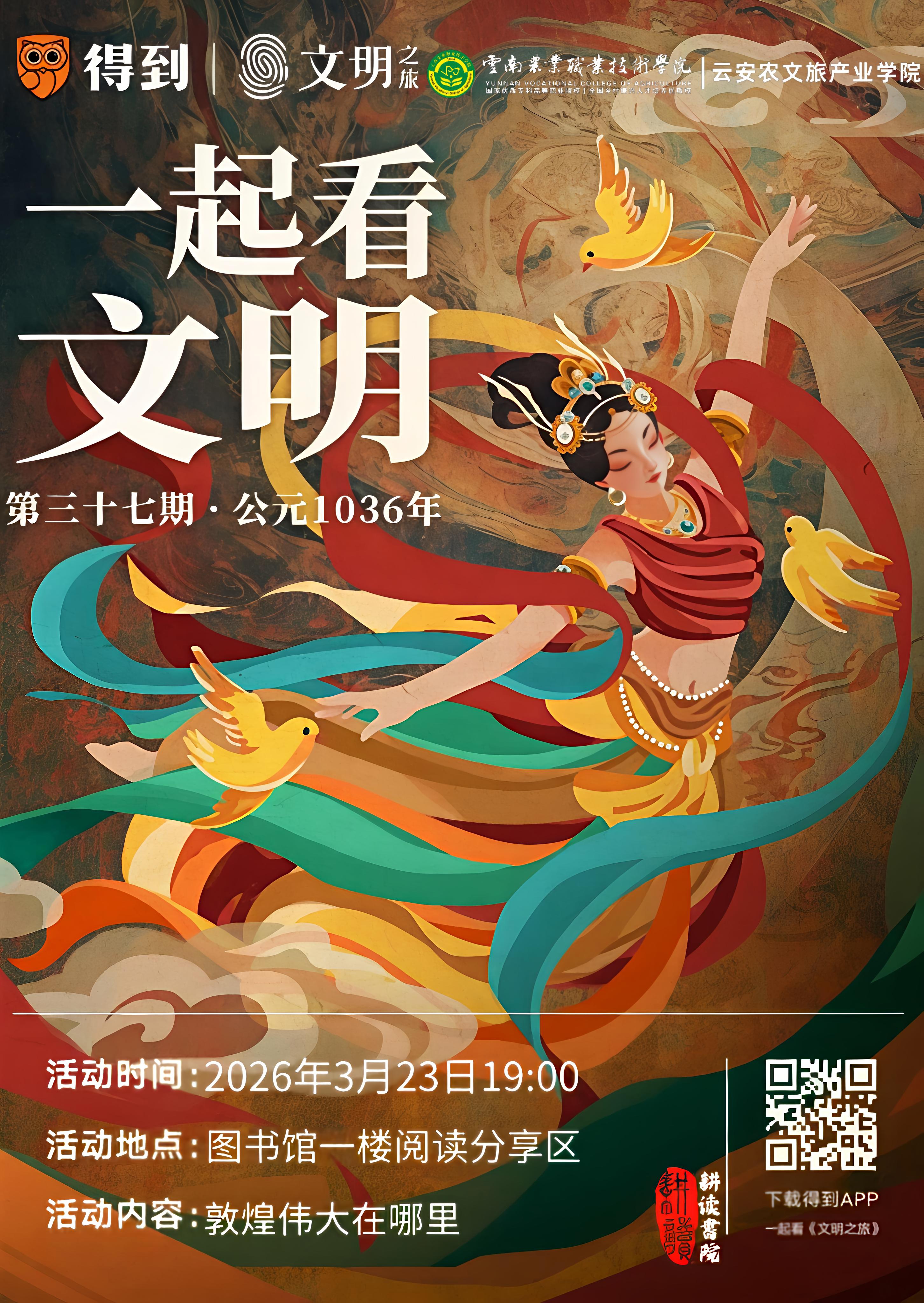 2026年3月23日19:00,云南农业职业技术学院云安农文旅产业学院于学校图书馆一楼阅读分享区举办《文明之旅》线下观影活动。本期活动以“敦煌伟大在哪里”为主题,由25级食品智能加工技术二班段成媛同学担任主持,学院各专业同学积极参与,共同踏上一场跨越千年的文明探寻之旅。