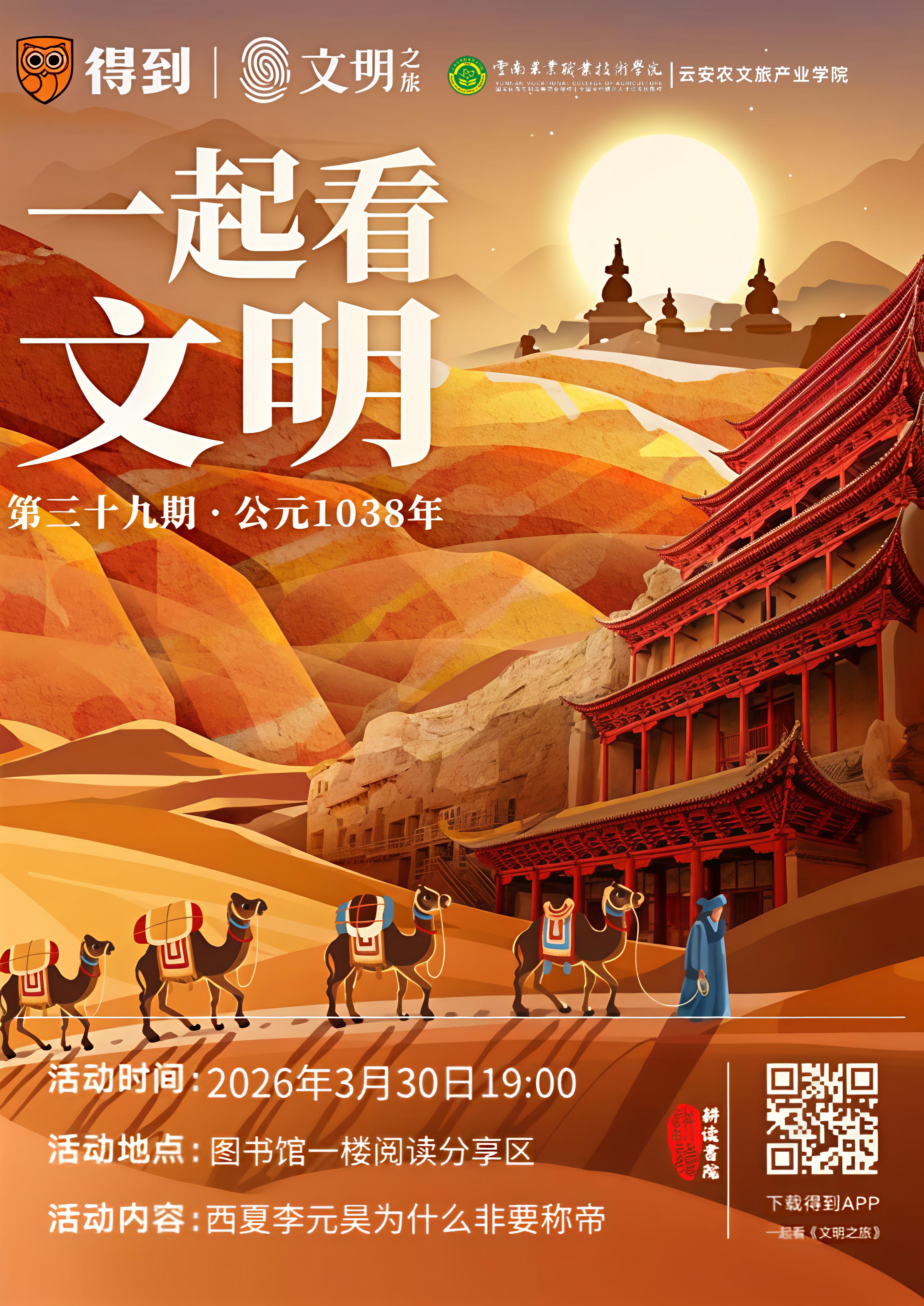 2026年3月30日19:00,云南农业职业技术学院云安农文旅产业学院举办第三十九期《文明之旅》线下观影活动,本期主题为“西夏李元昊为什么非要称帝”,由25林业技术一班童城同学主持。