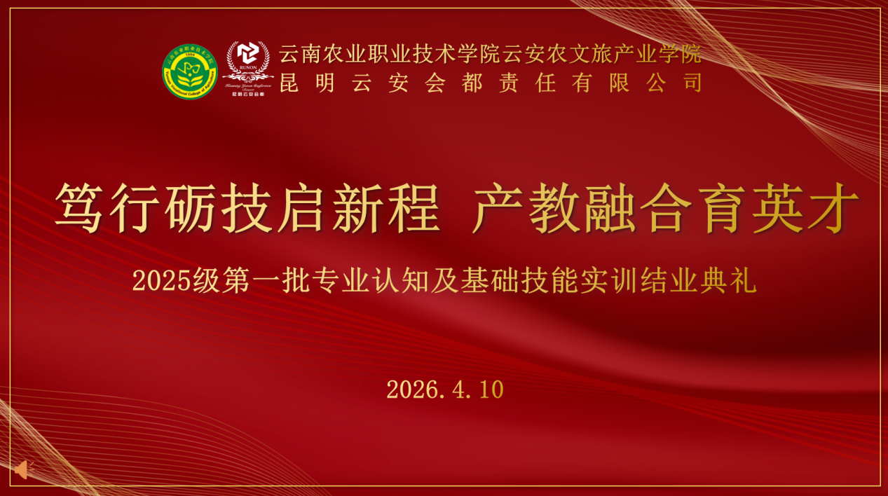 2026年4月10日下午,云南农业职业技术学院云安农文旅产业学院2025级烹饪工艺与营养、酒店管理与数字化运营专业第一批专业认知及基础技能实训结业典礼,在云安会都会堂402会议室顺利举行。本次典礼以“笃行砺技启新程产教融合育英才”为主题,全面总结为期4周的驻企实训成果,表彰优秀参训学生,深化校企协同育人成效。
