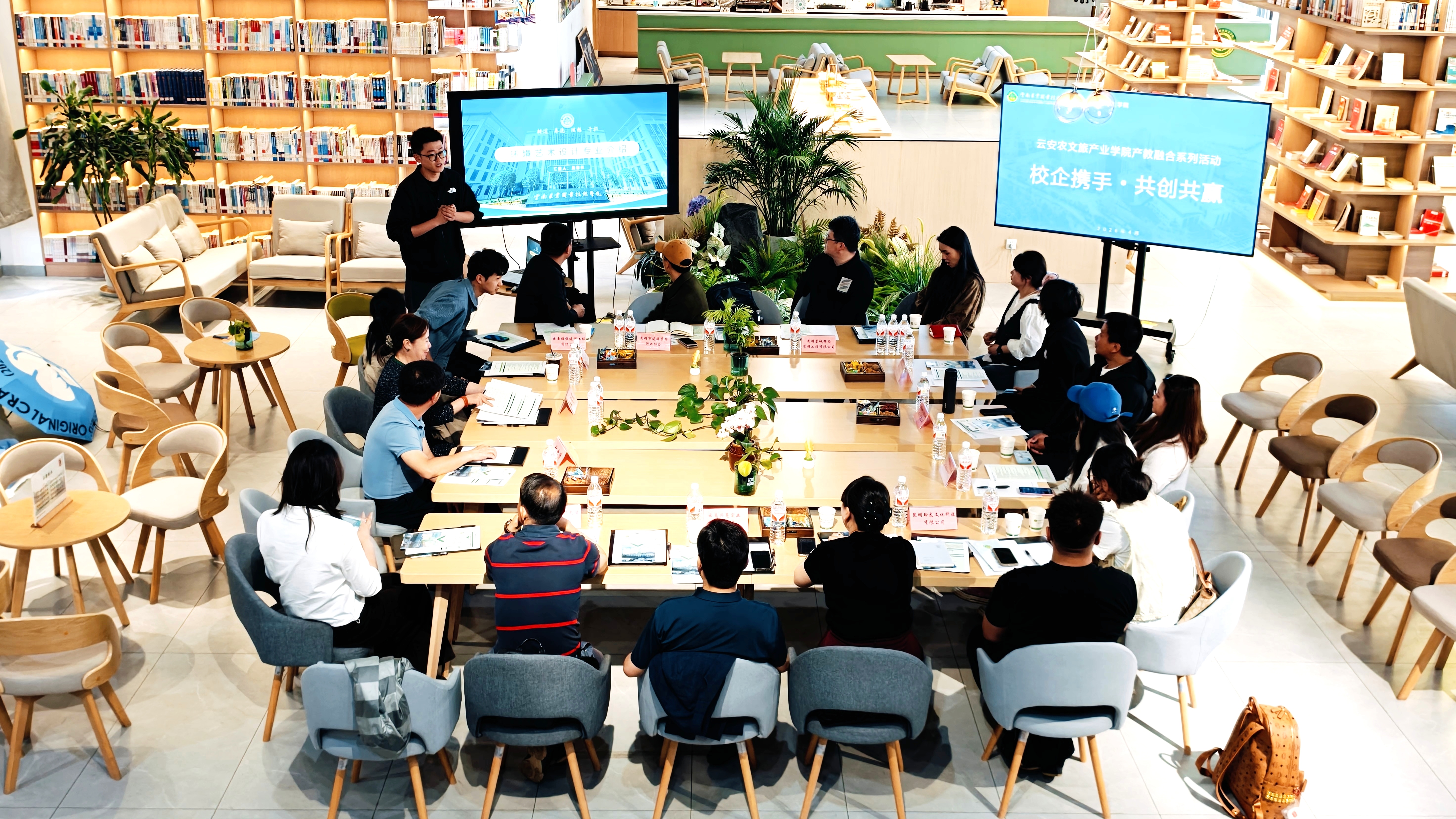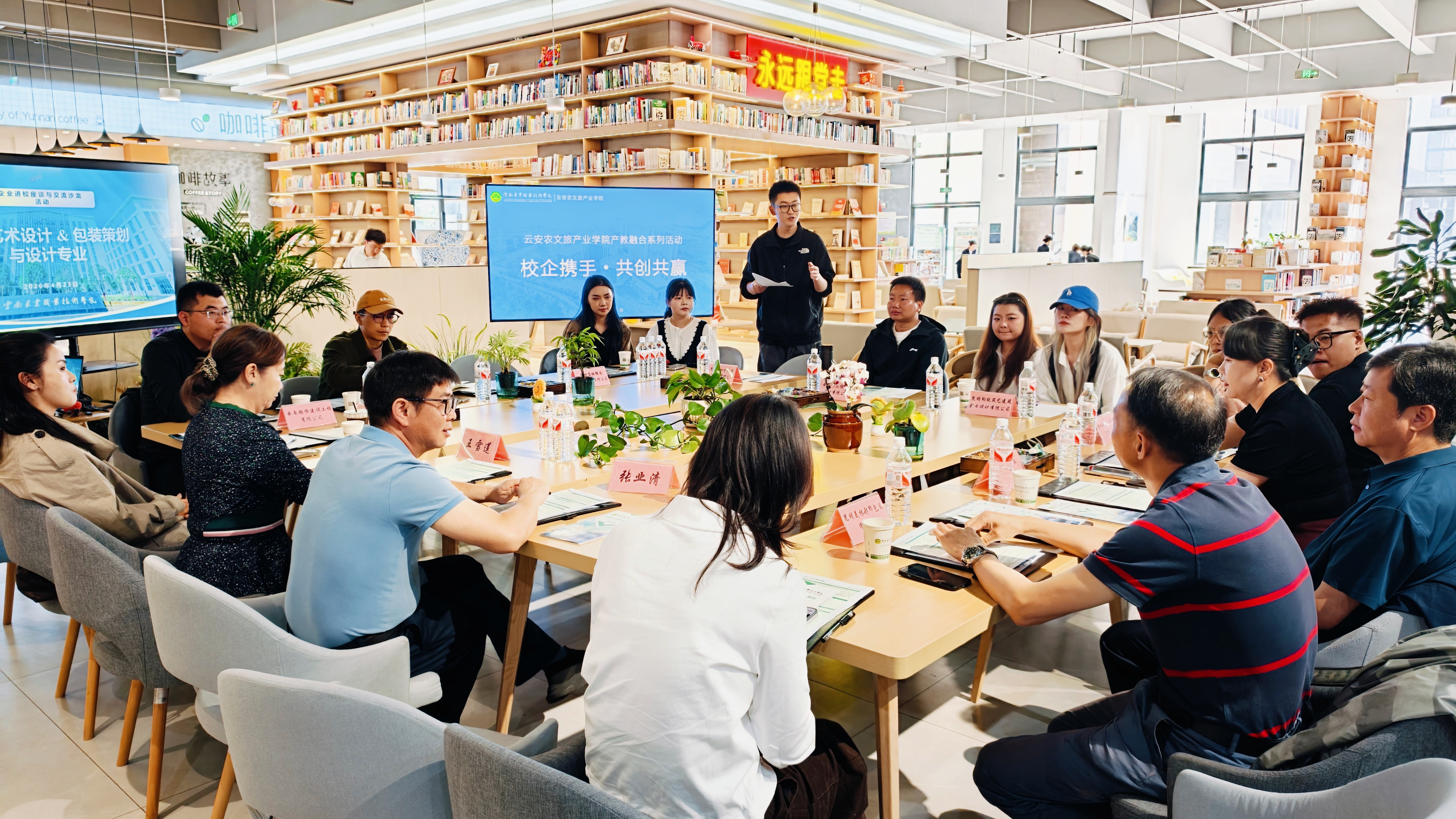 产教融合4月23日上午,云南农业职业技术学院云安农文旅产业学院产教融合系列活动 —— 环境艺术设计专业、包装策划与设计专业专场,在图书馆一楼举办。学院特邀昆明市建筑装饰行业协会、昆明合四方装饰设计工程有限公司、云南醉三维装饰设计有限公司、云南锘恒建设工程有限公司、昆明钧锐筑艺建筑室内设计有限公司、昆明玲龙文化科技有限公司、云南兴亮实业有限公司、云南 “礼先生” 公司、昆明美林彩印包装有限公司、御剑窑公司等多家企业代表参加。学院党总支副书记张业清、副院长王雪莲出席活动,环境艺术设计、包装策划与设计专业全体教师参加座谈。座谈会由环境艺术设计专业负责人吴春桃主持。